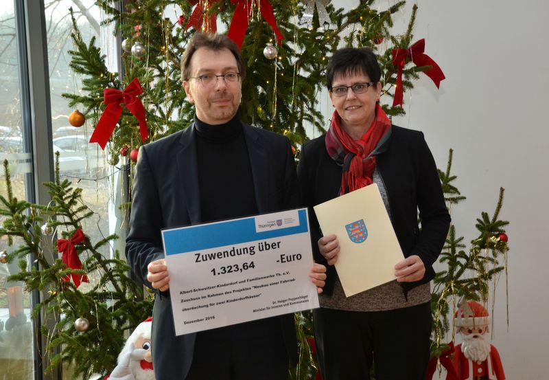 Eine "vorweihnachtliche Gabe" hatte der Thüringer Innenminister - Dr. Holger Poppenhäger für das Kinderdorf parat. Am 22. Dezember 2016 wurde durch Herrn Dr. Hinkel, Abteilungsleiter im Ministerium, ein Zuwendungsbescheid, i. H. von 1.323,64 €, im Auftrag des Ministers, überreicht. [...] Frau Winkler nahm den "symbolischen Scheck" freudig entgegen. Die Verwendung der Mittel, wobei auch ein Eigenbeitrag geleistet wird, ist für die Errichtung einer überdachten Fahrradeinhausung.